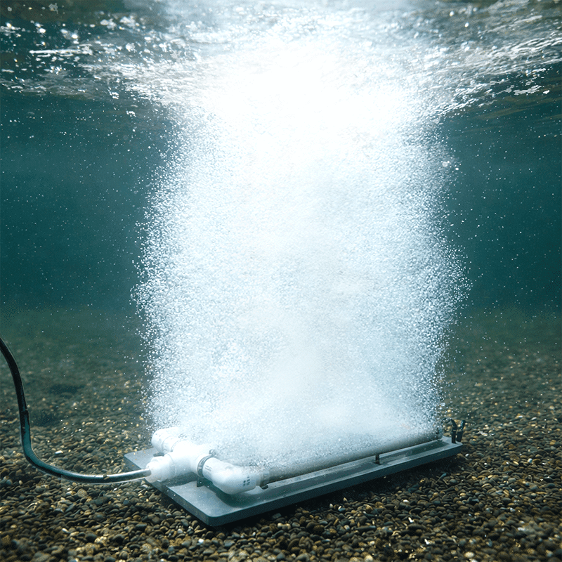 The Air Stream bottom diffuser easily moves hundred of gallons of water per minute from lower in a pond or lake bottom. By adding oxygen through an air diffuser, a gas transfer occurs which highly improves water quality and clarity. This degassing also removes foul-smelling gasses and improves oxygen levels lower in the water. These diffusers will easily handle between 1-3.5 CFM per diffuser, easy to install or move around.